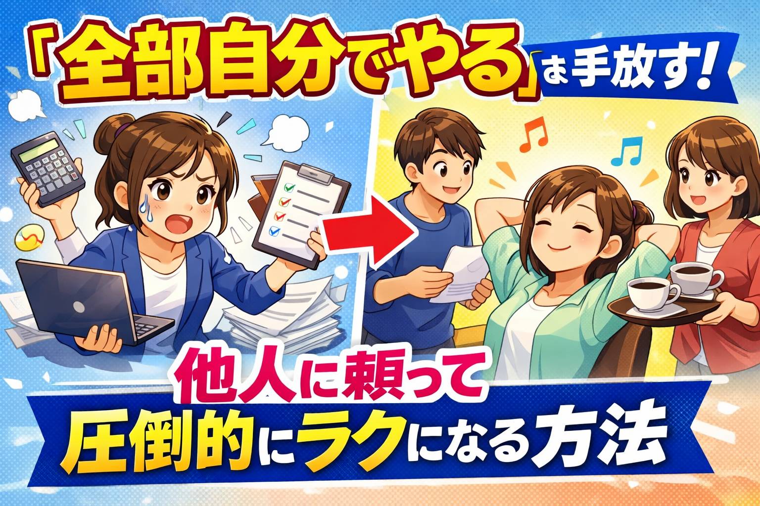 福原です、 あなたは人に迷惑をかけてはいけない、と教えられてきましたか? 「人に迷惑をかけたくない」 「自分でやったほうが早いし確実だ」 そう自分に言い聞かせて、今日も一人で大量のタスクを抱え込んでいませんか? 本当は「もう限界かもしれない」「誰か助けてほしい」と感じているのに、いざとなると人に頼ることができない。 その結果、心も体もパンク寸前になってしまう。 そんな真面目で頑張り屋さんなあなたが、これ以上一人で苦しまないための方法をお届けします。 それは、『全部自分でやるを手放す』こと。 今回は、一人で抱え込むことが実はいかに非効率であるかという事実から、他人に頼ることで得られる圧倒的な余裕の作り方までを順を追ってお伝えします。 最後まで読めば、「人に頼ることは決して迷惑ではない」という真実に気づき、明日から驚くほど軽やかな気持ちで1日を過ごせるようになるはずです。 なぜ自分一人で全部やろうとすると、うまくいかないのか? 「自分でやったほうが早い」 これは、多くの人がおちいりがちな罠です。 一人で全部やろうとすると、かえって物事は前に進まなくなってしまいます。...